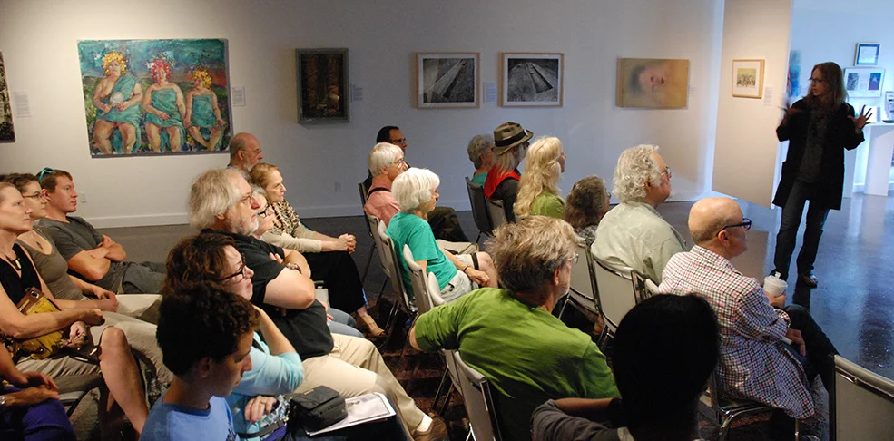 Since 2005 I have coordinated monthly shows and discussions at First Unitarian Universalist Church of San Diego. It is a support group for artists. I had a show in the venue in 2004 and no one came. It was my husband and I and our platter of cheese. When Suzette Southfox asked if I would take over the group in 2005 I swore another artist would not spend a night alone crying in the deli platter, so I set up a discussion format where artists can bring in up to three pieces of art to discuss. This makes them eligible for a show. That way at least artists are there to support other artists. It is about participation and community. We have been going strong ever since.