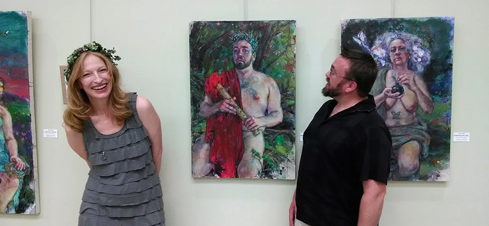 Embody Your Muse - Mollie Kellogg - Mollie Kellogg at First UU Art Guild 2014 reception with model, Roy Attridge
